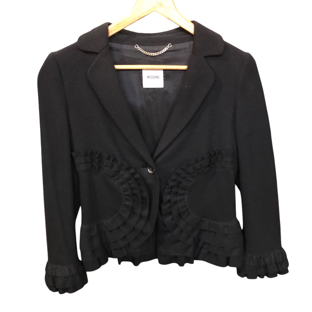 Black wool Moschino blazer with frilled pockets + bottom sleeves